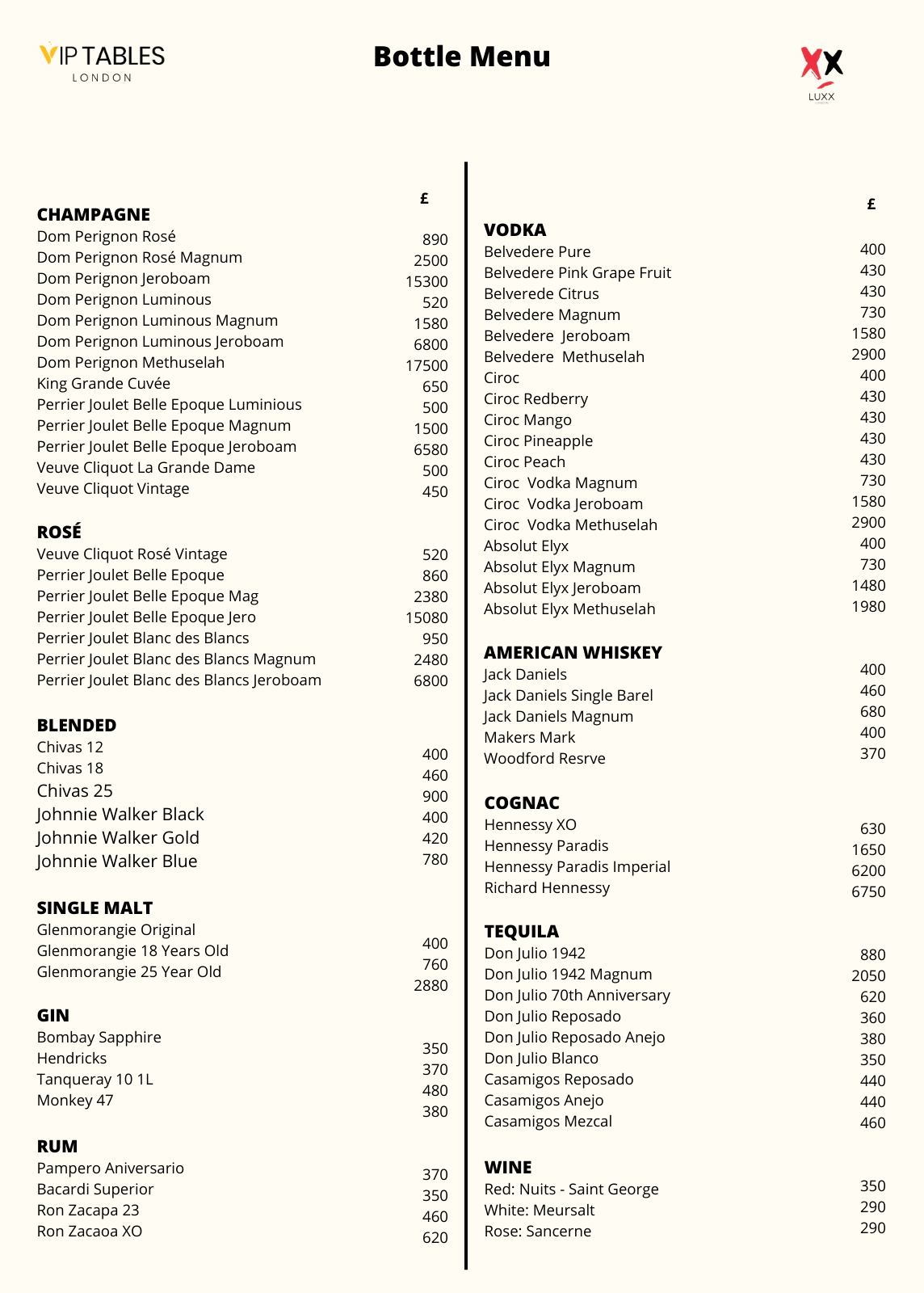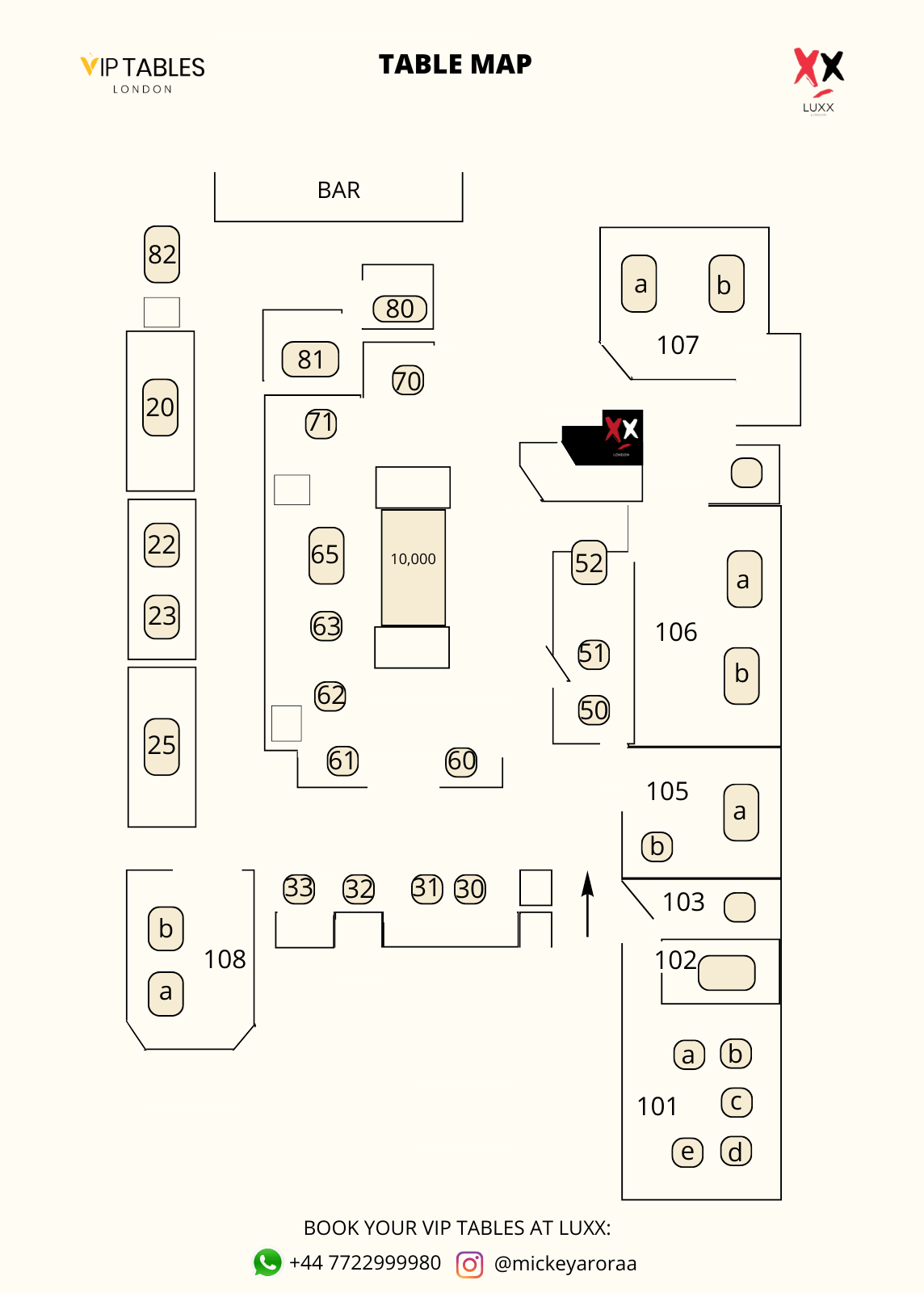 On the other hand, when it comes to Table Booking, there are two types of tables at Luxx, The Standard and The VIP. For mixed groups the first one has a price of £1000 minimum spend for groups of up to 3 people and £2000 minimum spend for groups of up to 10 guests. The second table has a cost of £2000 minimum spend for groups of up to 3 guests and £3000 minimum spend for groups of up to 10.