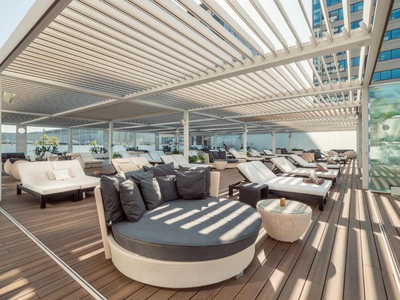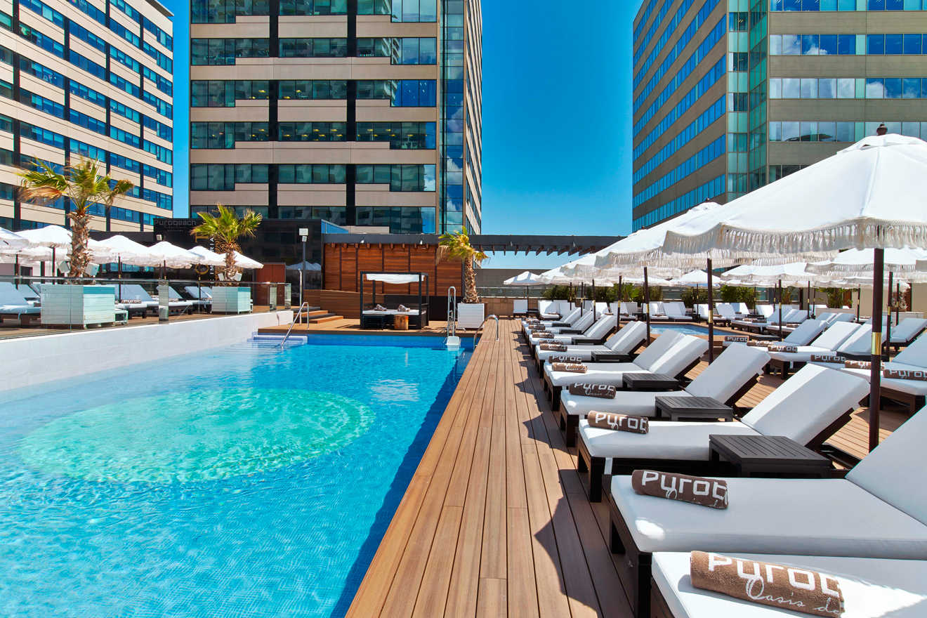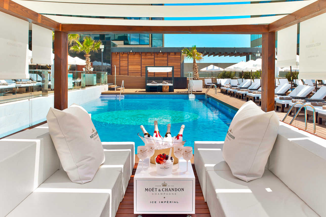 Take a refreshing dive into the pool and immerse yourself in the experience while enjoying breathtaking views of Barcelona’s skyline. Throughout the day, plush sunbeds await your relaxation. Each sunbed reservation includes a towel and a welcome tray featuring fresh fruit, mineral water, after-sun lotion, and a revitalizing smoothie.