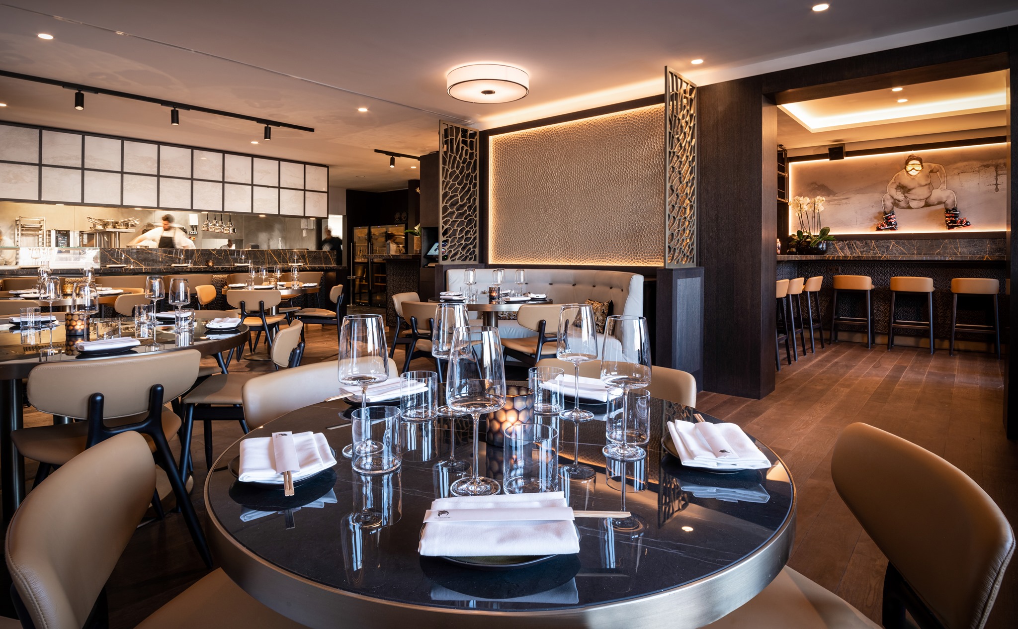 Nestled in the trendy Courchevel 1850, Sumosan introduces its first Alpine hub within the Six Senses Residences, creating a unique fusion of minimalist Japanese design with subtle alpine influences. The playful integration of the iconic Sumosan Sumo figure, adorned in various ski attire, adds a touch of humor to the ambiance. Offering a perfect après-ski experience, the bar boasts an array of creative cocktails complemented by a delectable selection of sushi and sashimi. The restaurant, on the other hand, exclusively opens its doors for dinner service.