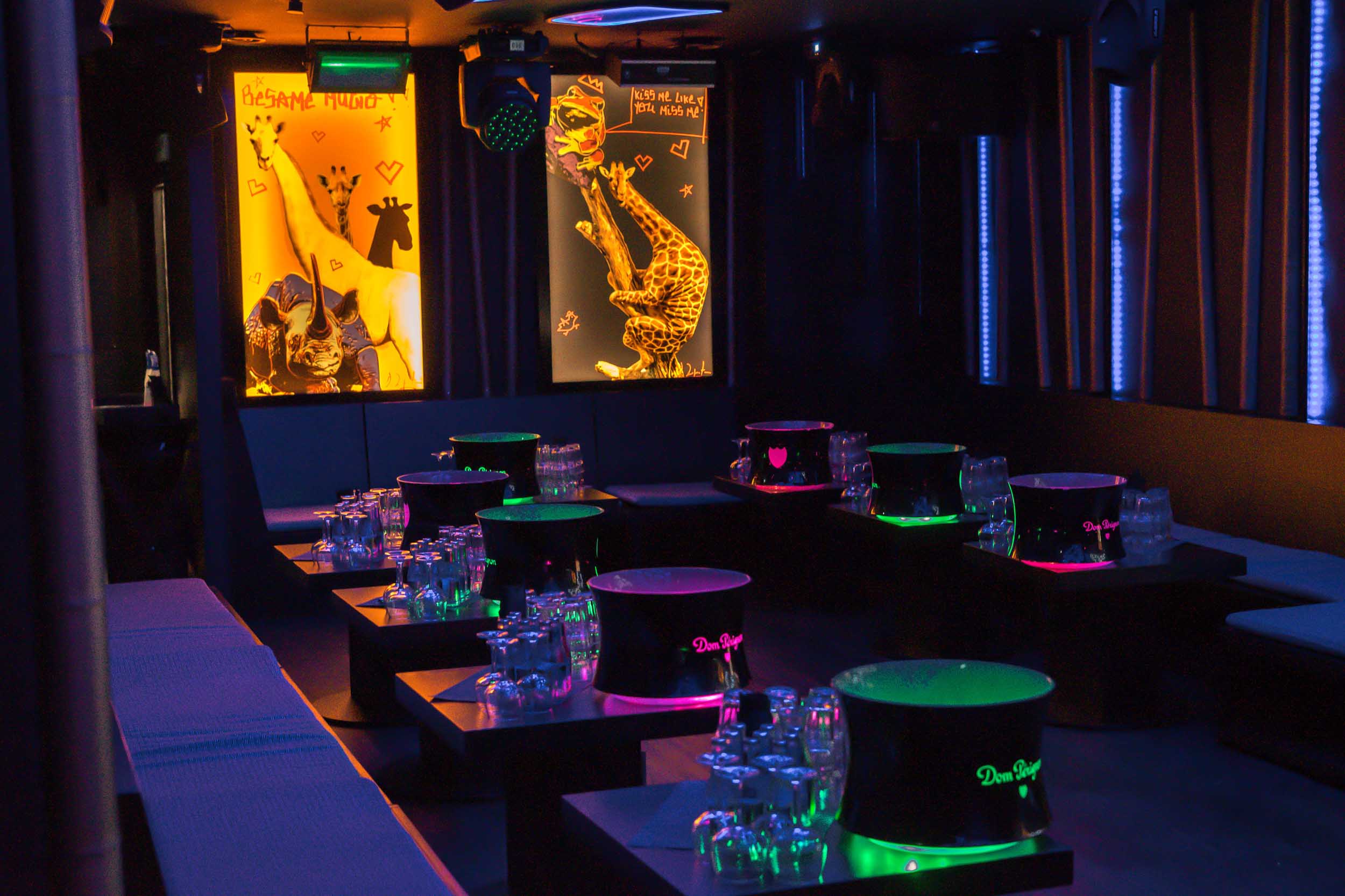 The interior of Sumosan Twiga exudes a contemporary and abstract design, accentuated by modernistic elements. Behind the DJ booth, steampunk-style bronze fixtures adorn VIP tables, while the ceiling evokes the image of a fractured ice sheet illuminated by the club’s sophisticated lighting system. Cream-colored walls adorned with delicate picture frames and circular mirrors further contribute to the distinct and captivating atmosphere that defines Sumosan Twiga.