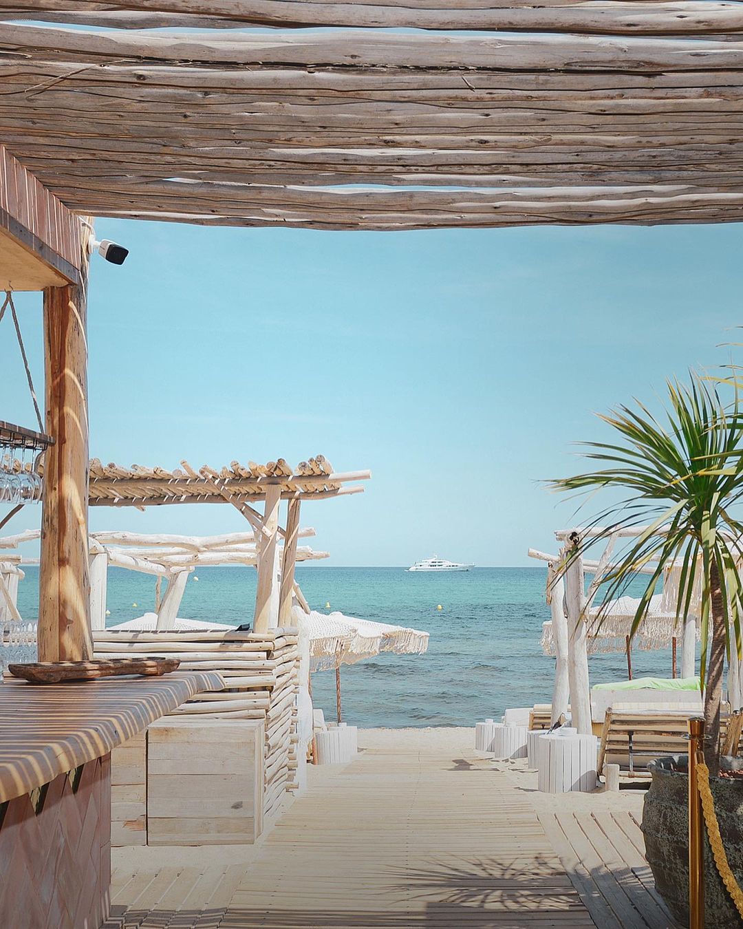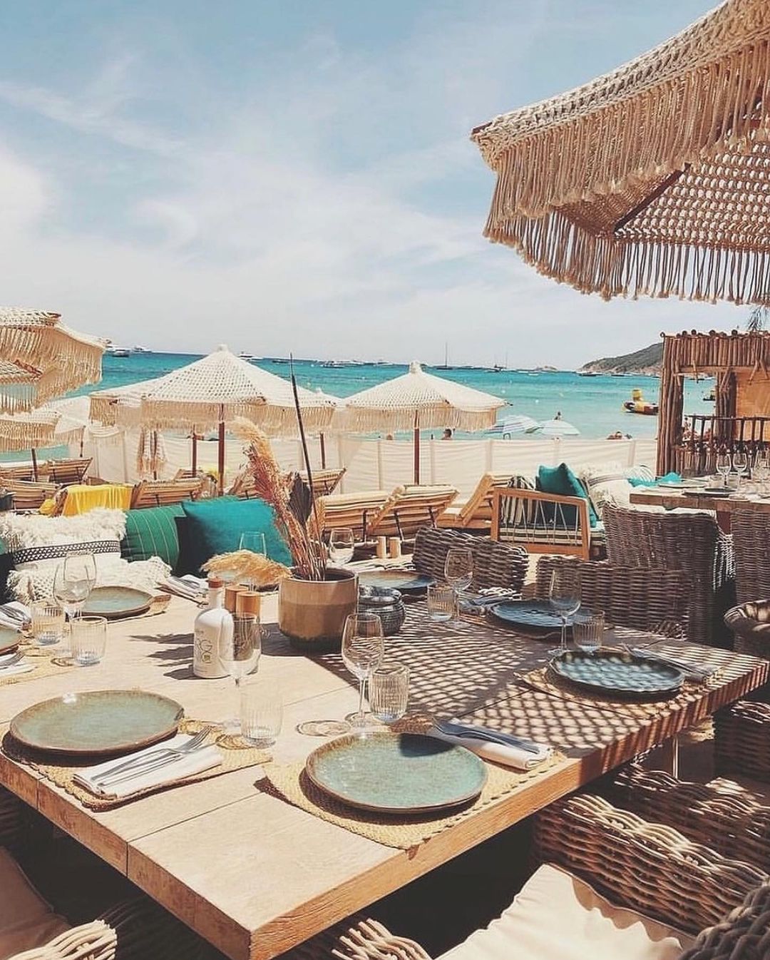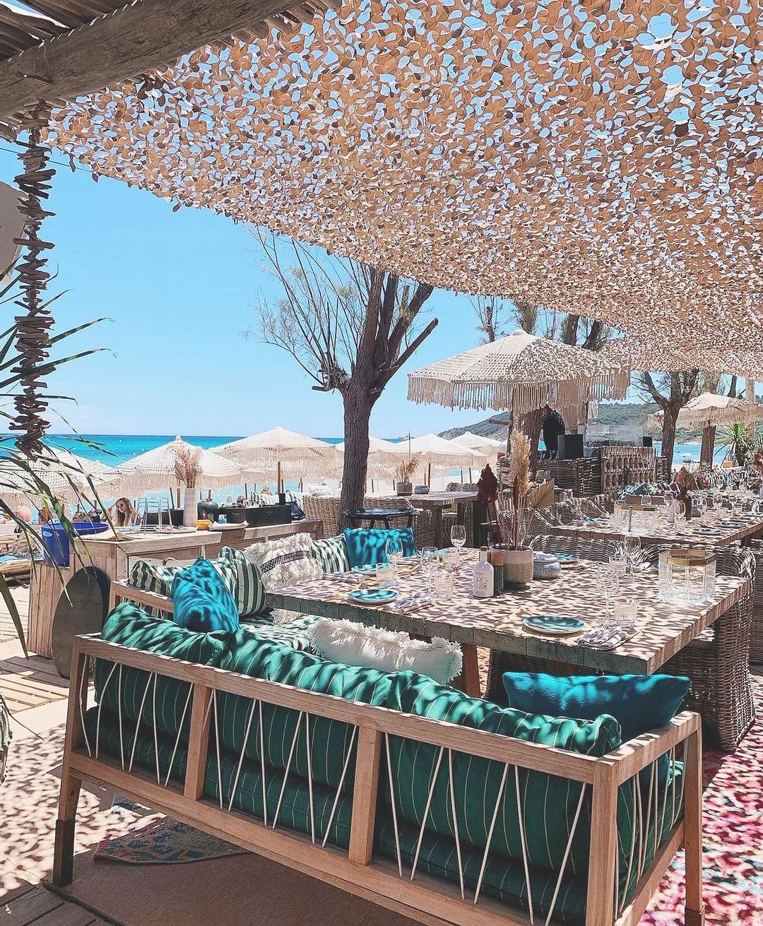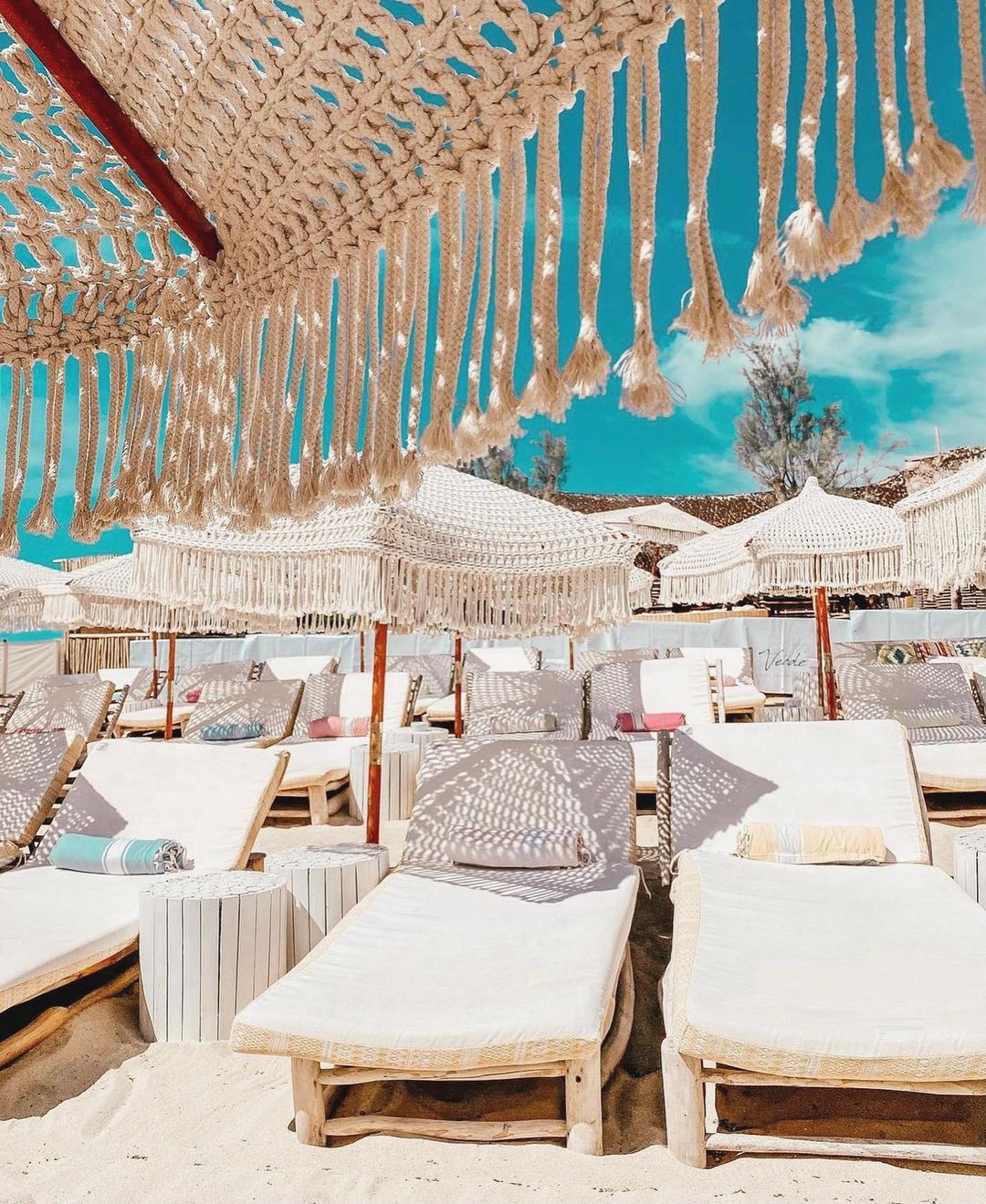 Nestled along Pampelonne Beach, Verde Beach Saint-Tropez offers a picturesque view of lush trees gently swaying by the water. The ambiance combines Parisian cabanas with Provençal charm, creating a charming atmosphere. The boho-chic decor features wood and local vegetation, enhancing the natural allure of the surroundings.