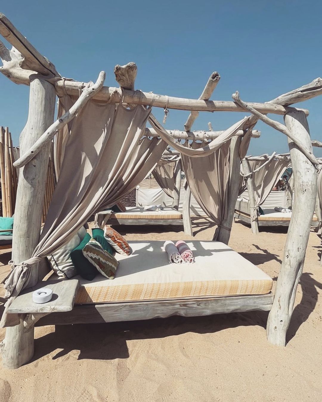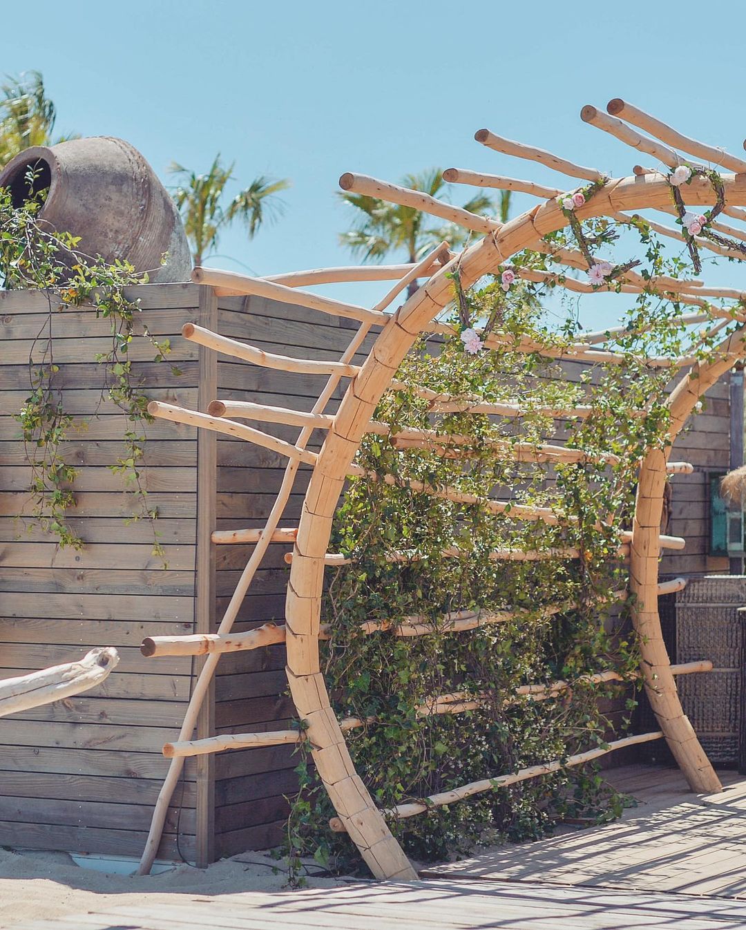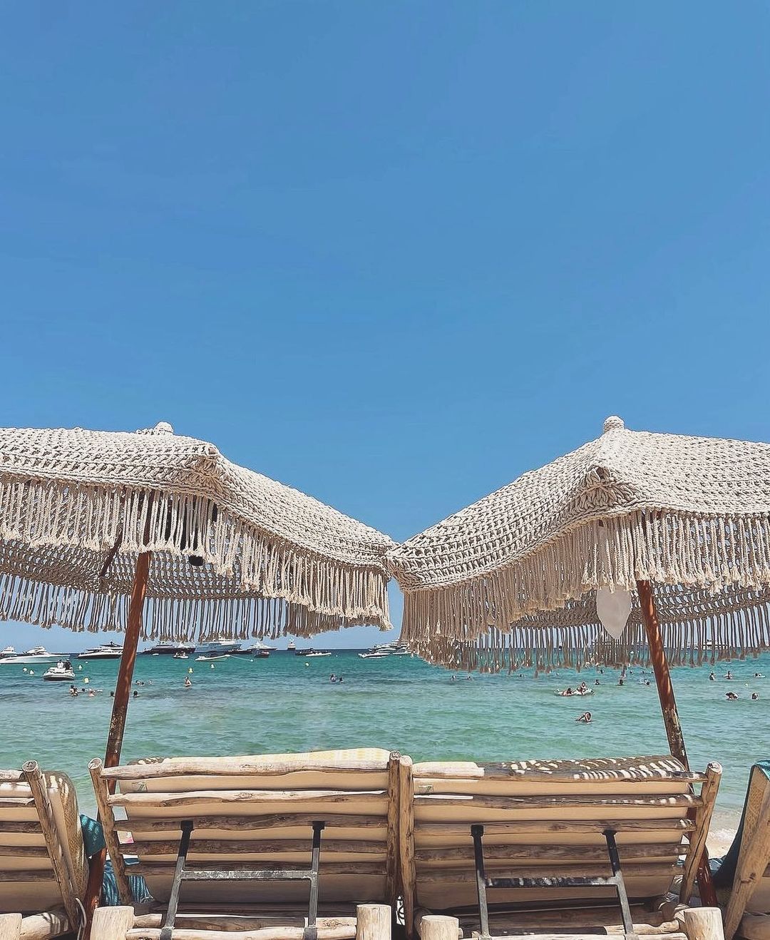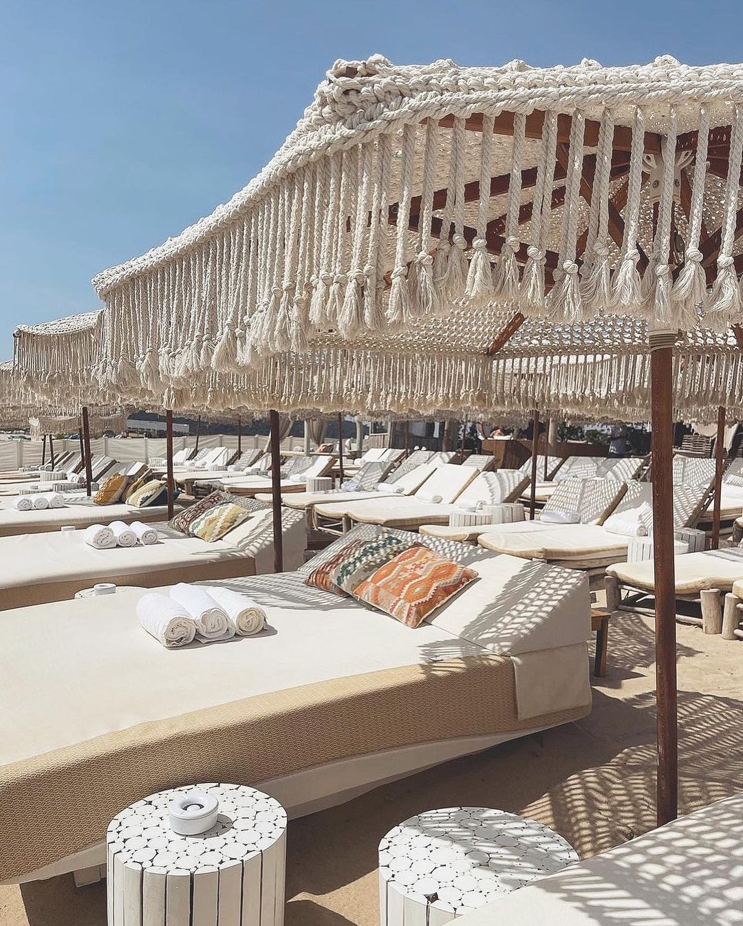 Nestled along Pampelonne Beach, Verde Beach Saint-Tropez offers a picturesque view of lush trees gently swaying by the water. The ambiance combines Parisian cabanas with Provençal charm, creating a charming atmosphere. The boho-chic decor features wood and local vegetation, enhancing the natural allure of the surroundings.